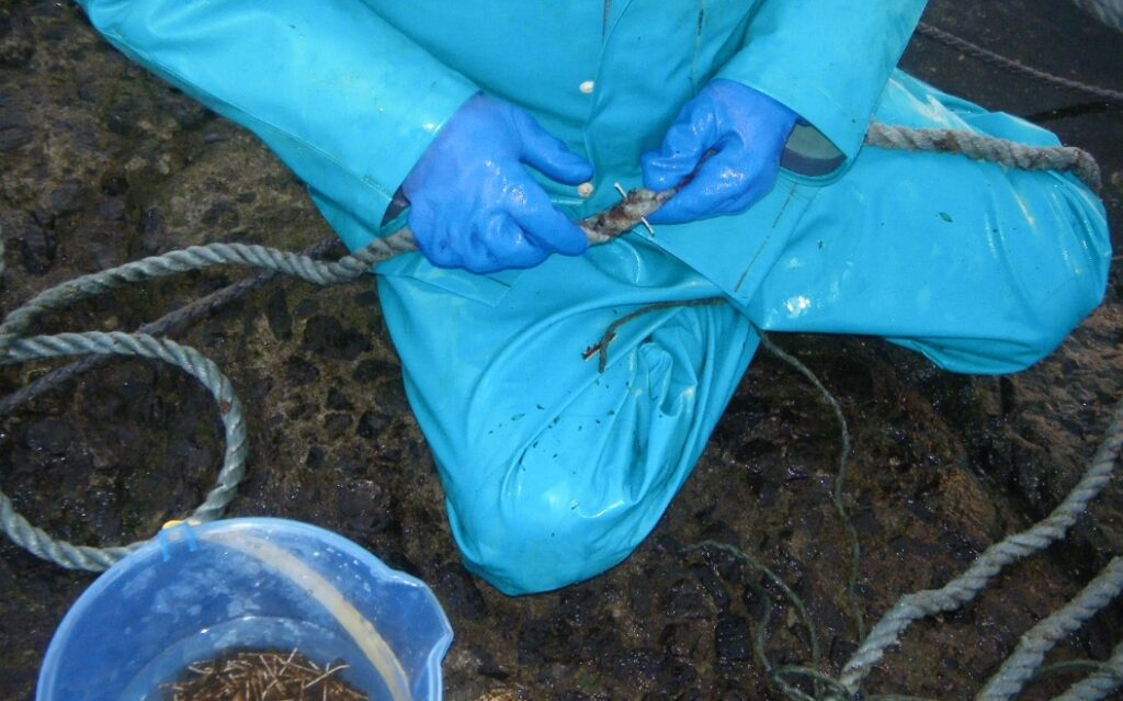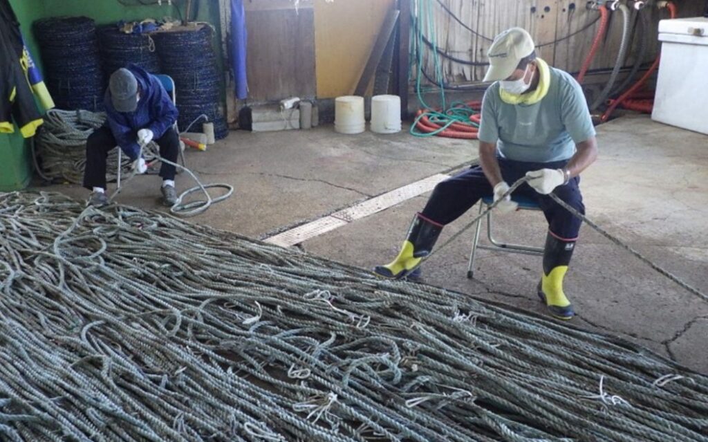 養殖を終えたロープや浮き球は干場で乾燥させた後に、感謝を込めて手作業できれいにしていきます。
