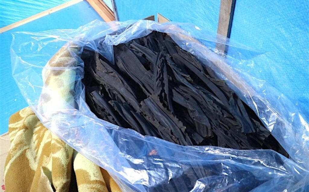 機械乾燥した昆布は干し台から外して、選別・加工場に持っていき山積みにしていきます。
