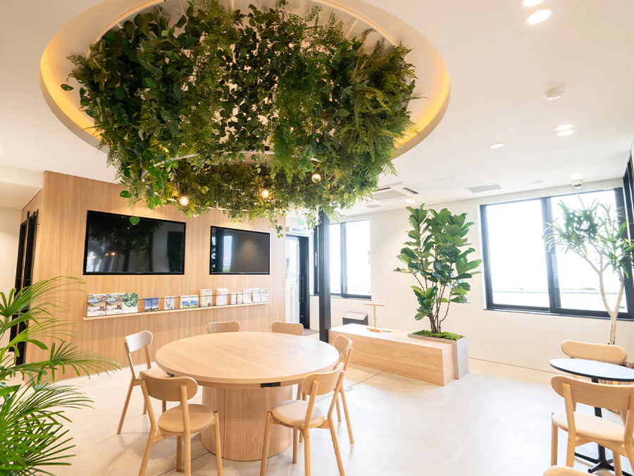 バス待合所機能を兼用したラウンジとなります。バス利用者だけでなく、ちょっとした仕事や勉強にも利用でき、友人同士の集まりなど気軽に立ち寄れる場所です。たっぷりの緑と、解放感のある造りで居心地のよい空間です。